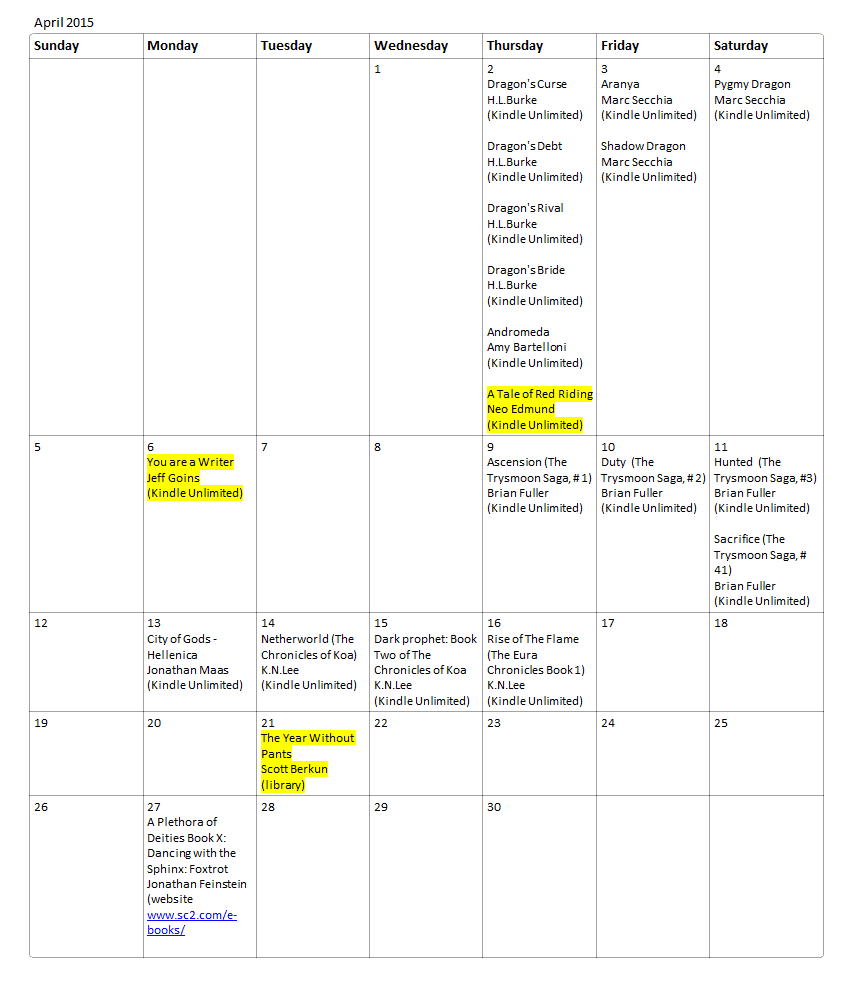 Here is my reading log from April 2015. April was another month where I binge-read fantasy / young-adult books. Yup. On April 2, and April 3, I was sick and wasn’t doing well. So I just read all those novellas!