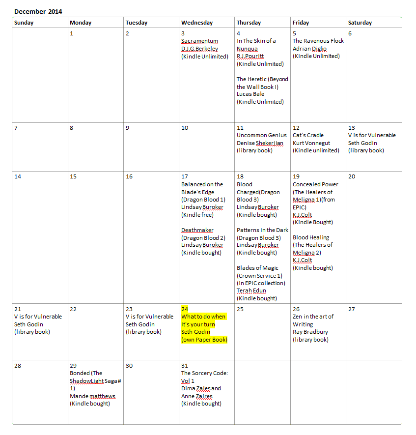 Here is my reading Log from December 2014. I read 18 books last month, but a lot of those were binge reading fantasy / science fiction books. Among the fiction I read,
