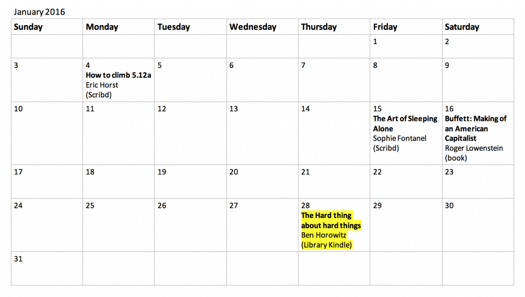 Here is my reading log from January 2016. After a holiday month of a minuscule amount of reading, I was back to reading a few books. This was the first month of my reading experiment and I struggled with it. I finished my first book on my reading experiment list – Buffett: Making of an American Capitalist by Roger Lowenstein – but then decided to give in to my urge to read something else.