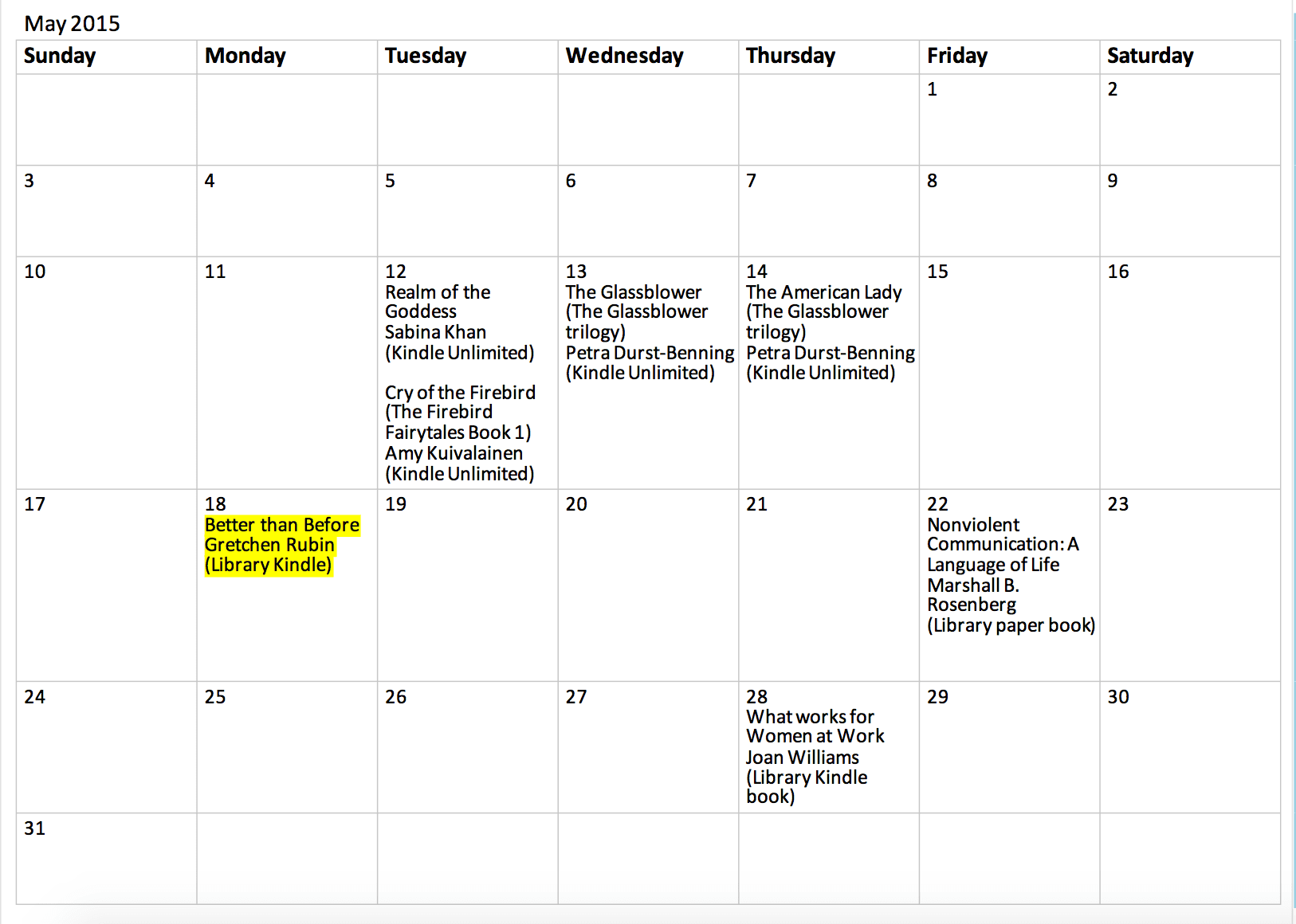 Here is my reading log from May 2015. In mid-May I made a Rule that I could read fantasy/historical/science fiction only on a cardio machine. Thanks to that, I just didn’t read any the second half of the month.